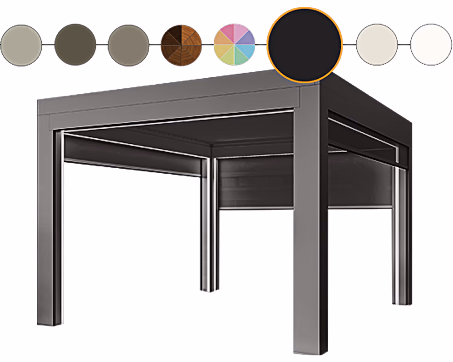 Louvered Roof Systems are available in six standard colors: white, beige, adobe, gray, bronze, and black. For those seeking a personalized touch, thousands of custom colors, including woodgrain finishes, can be selected for an additional fee. We use a chemical textured powder coat to apply the color, which not only offers a scratch-resistant surface but also delivers a stylish matte finish.